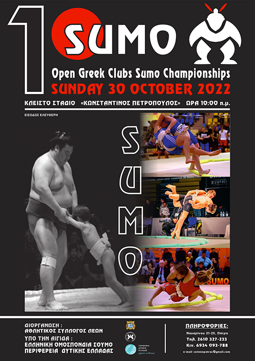 «Με χαρά ανακοινώνουμε την διοργάνωση του ‘1ου Sumo Open Greek Clubs Championship’ στην Πάτρα την Κυριακή 30 Οκτωβρίου 2022, υπό την αιγίδα της Πανελλήνιας Ομοσπονδίας Σούμο και της Περιφέρειας Δυτικής Αττικής.