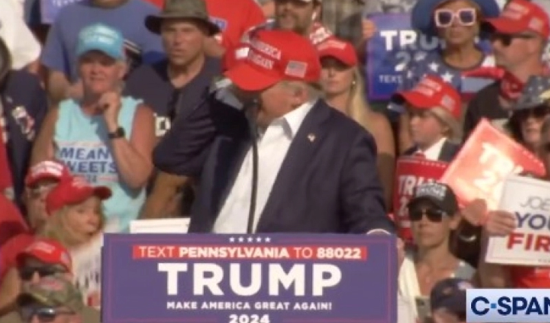 Αμέσως ο υποψήφιος των Ρεπουμπλικάνων έπιασε το δεξί του αυτί, ενώ αίματα γέμισαν το πρόσωπό του. Στη συνέχεια κοίταξε το χέρι του και έπεσε στα γόνατα προτού μέλη της Μυστικής Υπηρεσίας σπεύσουν γύρω του για να τον προστατεύσουν.