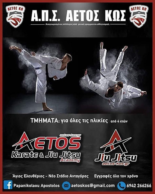 Παράλληλα, με μεγάλη υπερηφάνεια, ανακοινώνουμε την έναρξη της νέας δυναμικής και δημιουργικής αθλητικής σεζόν στον Αθλητικό Σύλλογο "ΑΕΤΟΣ ΚΩ", όπου οι πολεμικές τέχνες έχουν πρωταγωνιστικό ρόλο. Ο Σύλλογός μας, πιστός στις αξίες της πειθαρχίας, της αυτοάμυνας και της ενδυνάμωσης του σώματος και του πνεύματος, προσφέρει ένα ολοκληρωμένο πρόγραμμα εκπαίδευσης για όλους τους ενδιαφερόμενους.