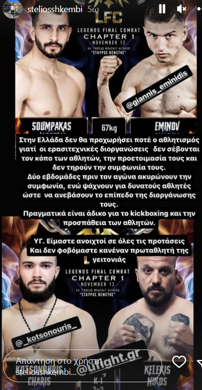 Ο Στέλιος Σκέμπης , προπονητής των δύο εκ Βορρά ορμώμενων αθλητών, βάζοντας σε story του τα ακυρωθέντα πόστερ των αγώνων στο ‘LFC – Legends Final Combat’, έγραψε αυτό που μπορείτε να διαβάσετε εδώ :