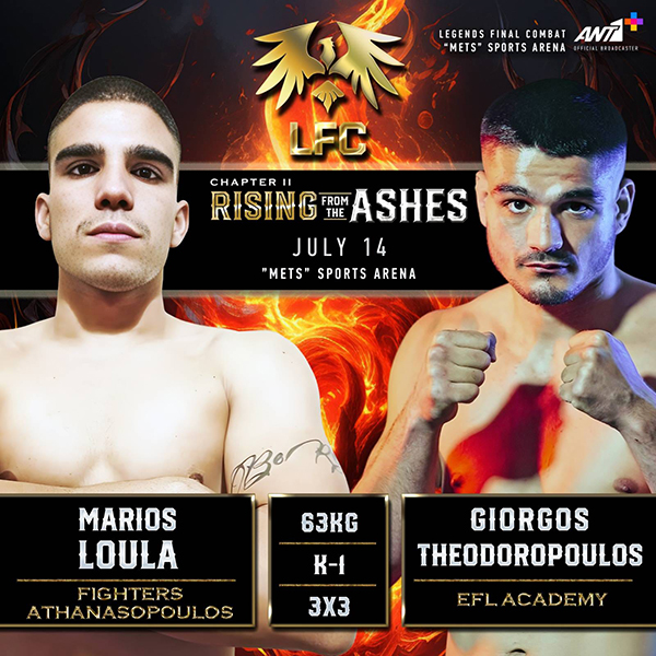 «Καλωσορίζουμε στο ρινγκ των θρύλων τον Μάριο Λούλα από τους Fighters Αθανασόπουλος, που θα αντιμετωπίσει τον Γιώργο Θεοδωρόπουλο από το EFL Academy σε μια συναρπαστική μάχη με όρους K1 3Χ3 της main card.
