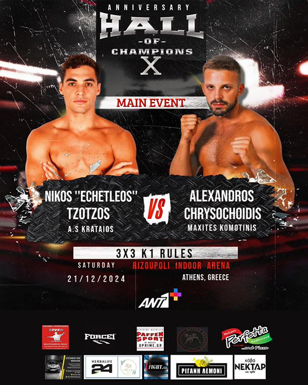 Ο Νίκος Τζώτζος αγωνίζεται με τον Αλέξανδρο Χρυσοχοΐδη στο main event του ‘Hall of Champions 10’ αυτό το Σάββατο 21 Δεκεμβρίου, σε μια μάχη που το κοινό αναμένει με μεγάλο ενδιαφέρον.