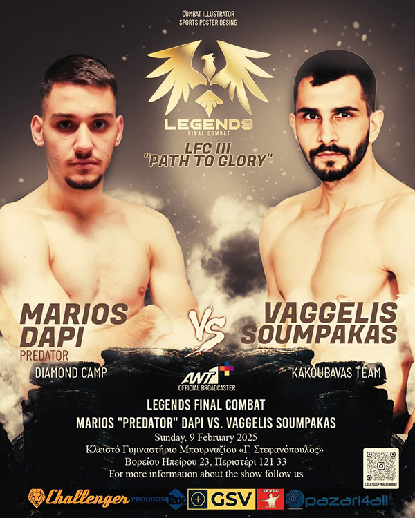 Το ‘Legends Final Combat 3’ ανακοίνωσε την πρώτη δυνατή μάχη για τα rankings του promotion ανάμεσα στον Μάριο Ντάπι (Diamond Camp) και τον Βαγγέλη Σουμπάκα (Kakoubavas Team) 9 Φεβρουαρίου στο Γ. Στεφανόπουλος στο Περιστέρι.