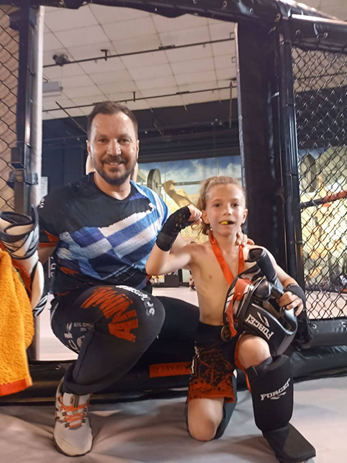 Πρόκειται για τον 8χρονο μόλις 20 κιλών Μάνο Βαρχαρίδη που κατάφερε στον αγώνα που έδωσε στο κλουβί της διοργάνωσης να επικρατήσει απέναντι στον αντίπαλό του Χριστόφορο Μακρίδη.