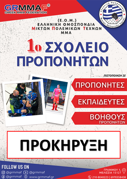 Η Ελληνική Ομοσπονδία Μικτών Πολεμικών Τεχνών ανακοινώνει την αλλαγή της ημερομηνίας διεξαγωγής του 1ου Σχολείου Προπονητών (Α’ μέρος) για την Αθήνα.