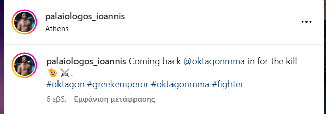 Αυτή είναι η τρίτη του παρουσία στην κορυφαία παραγωγή του ‘OKTAGON MMA’ με απόλυτο στόχο να πάρει την νίκη και όπως χαρακτηριστικά έγραψε στην ανακοίνωση της μάχης, πάει τώρα… για να «σκοτώσει»!