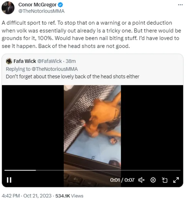 Ο McGregor έβαλε στον λογαριασμό του σχόλιο αναγνώστη που έκανε λόγο για παράνομα χτυπήματα του Makhachev στο πίσω μέρος του κεφαλιού του Volkanovski, για τα οποίο ο Νταγκεστανός ενδεχομένως να έπρεπε να αποβληθεί.