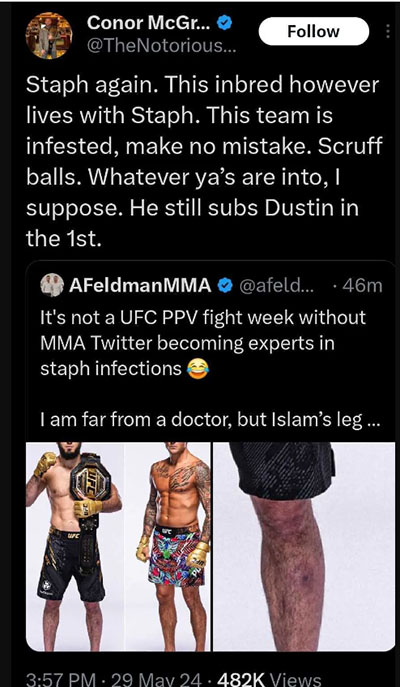 Στο twitter ένας χρήστης παρατήρησε το αριστερό γόνατο του Makhachev θεωρώντας πως πάσχει από σταφυλόκοκκο.