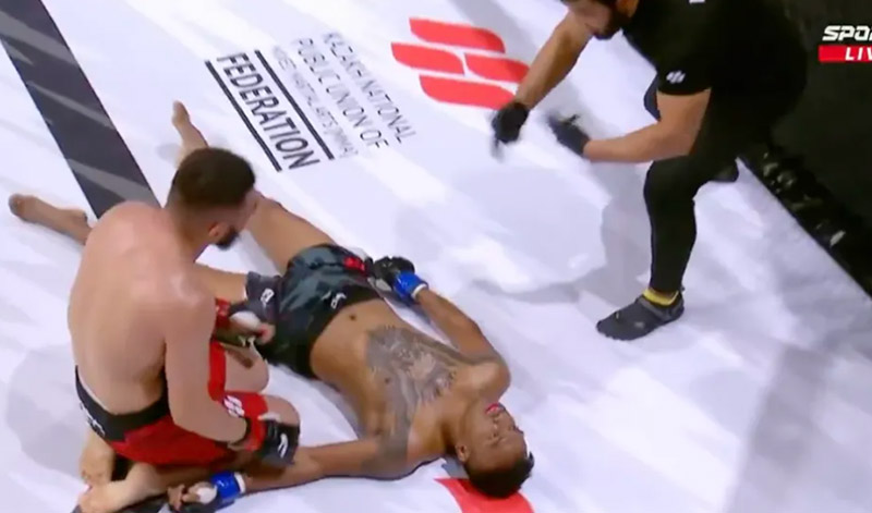 Ευτυχώς, ο Zhumabekov - ο οποίος κυριολεκτικά χτυπούσε τα χέρια του καθώς ο Raut βρισκόταν αναίσθητος στον καμβά - κατάλαβε ότι ο αντίπαλός του είχε τελειώσει και απελευθέρωσε τη λαβή του.