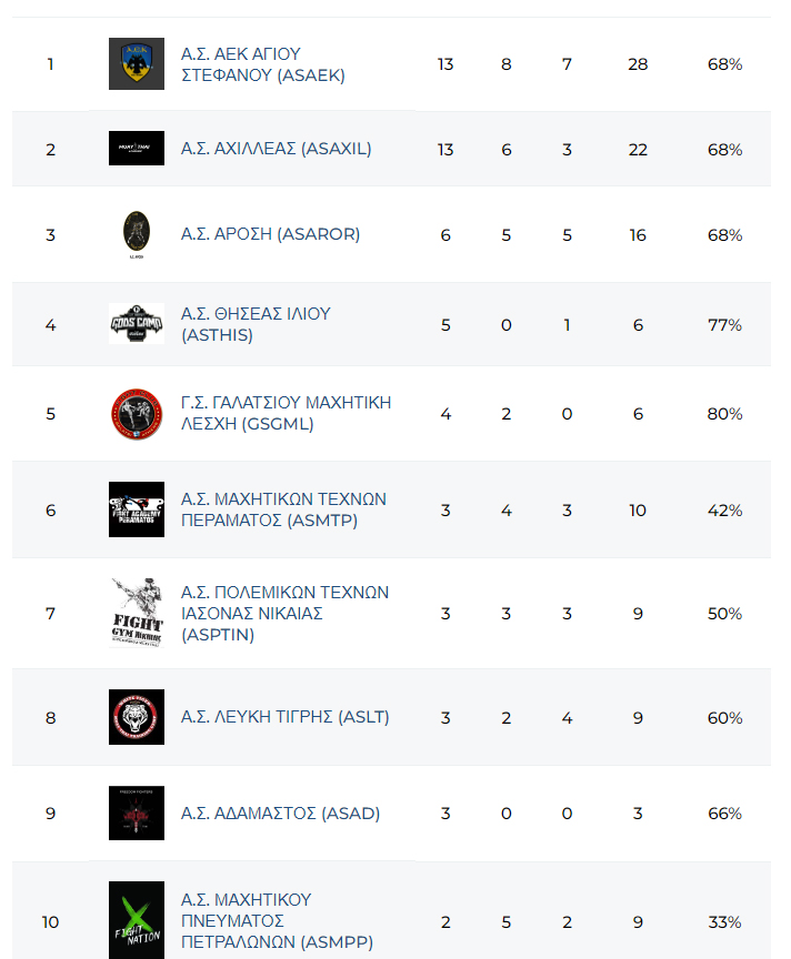Την 5άδα έκλεισαν ο ‘ΑΣ Θησέας Ιλίου – Gods Camp’ με 5 Χρυσά μετάλλια και 1 Χάλκινο, καθώς και ΄ΓΣ Γαλατσίου Μαχητική Λέσχη – Fight Club Galatsi’ με 4 χρυσά και 2 ασημένια.